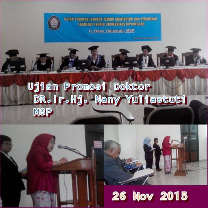 Di hadapan para penguji yang terdiri dari Dekan/Ketua Sidang (Ir. M. Agung Wibowo, MM, M.Sc., Ph. D), Sekretaris Sidang (Dr. Mussadun, ST, MT), Promotor (Prof. Dr. Ir. Sugiono Soetomo, DEA), Co-Promotor (Dr. Ir. Joesron Alie Syahbana, M.Sc), serta penguji eksternal (Prof. Dr. Ir. Djoko Sujarto, M.Sc dari ITB Bandung) dan juga penguji internal (Prof. Sudharto P. Hadi, Ph. D, Prof. Dr. Nurdien HK, Prof. Dr. rer.nat. Imam Buchori, Prof. Dr. Ir. Bambang Setioko, M.Eng) Nany yang merupakan Staff Pengajar di Jurusan PWK Undip mampu mempertahankan penelitiannya dengan nilai IPK 3,63 (Sangat Memuaskan).