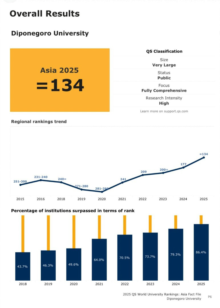 Dalam kategori penghargaan ini UNDIP menunjukkan performa peningkatan peringkat paling pesat dan konsisten dalam 5 tahun terakhir dari peringkat #241 di tahun 2021 menjadi #134 di QS World University Rankings: Asia 2025. Sementara pada kategori QS South Eastern Asia University Rankings 2025, UNDIP berada di peringkat ke-31 universitas terbaik di Asia Tenggara.
