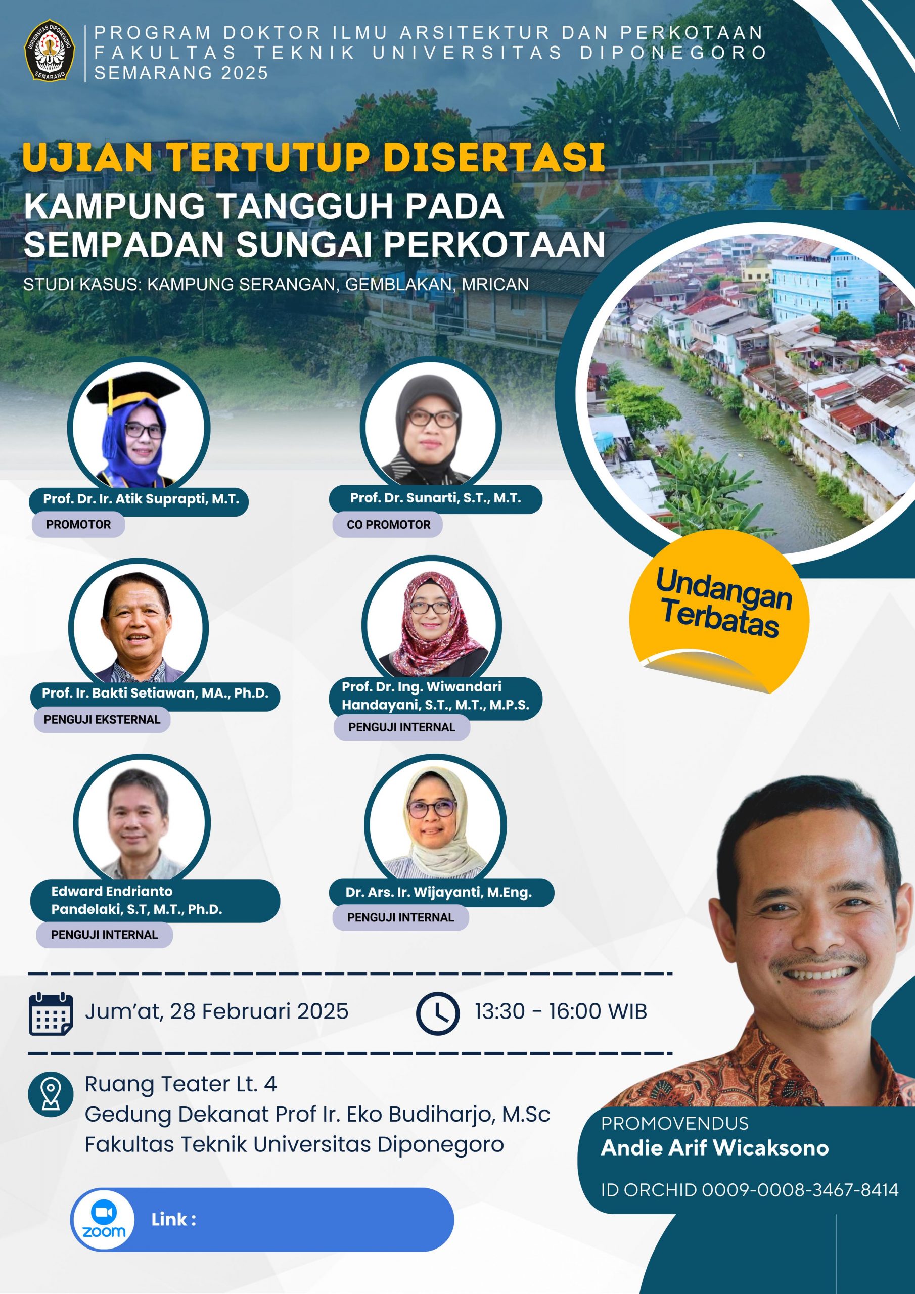Akan di Laksanakan Ujian Tertutup Disertasi yang berjudul ”Kampung Tangguh pada Sempadan Sungai Perkotaan.” oleh Promovendus Andie Arief Wicaksono ST MT. pada tanggal 28 Februari 2025.