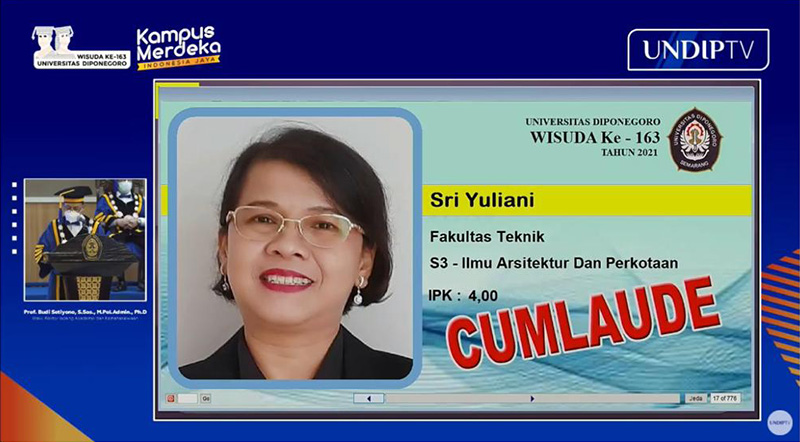Semarang, dtap.undip.ac.id,- Penghujung tahun 2021 menjadi saksi gigihnya perjuangan Inavonna, dosen arsitektur Universitas Trisakti Jakarta ini, berhasil meyakinkan para penguji di room ujian secara virtual pada ujian akhir disertasi, Rabu (29/12). Penelitian disertasinya yang mengambil tema “Kenyamanan Ruang Luar Komunal di Kampung-Kota (Studi Kasus: Kelurahan Petamburan Jakarta)” menjadi kado indah bagi PDIAP FT Undip.