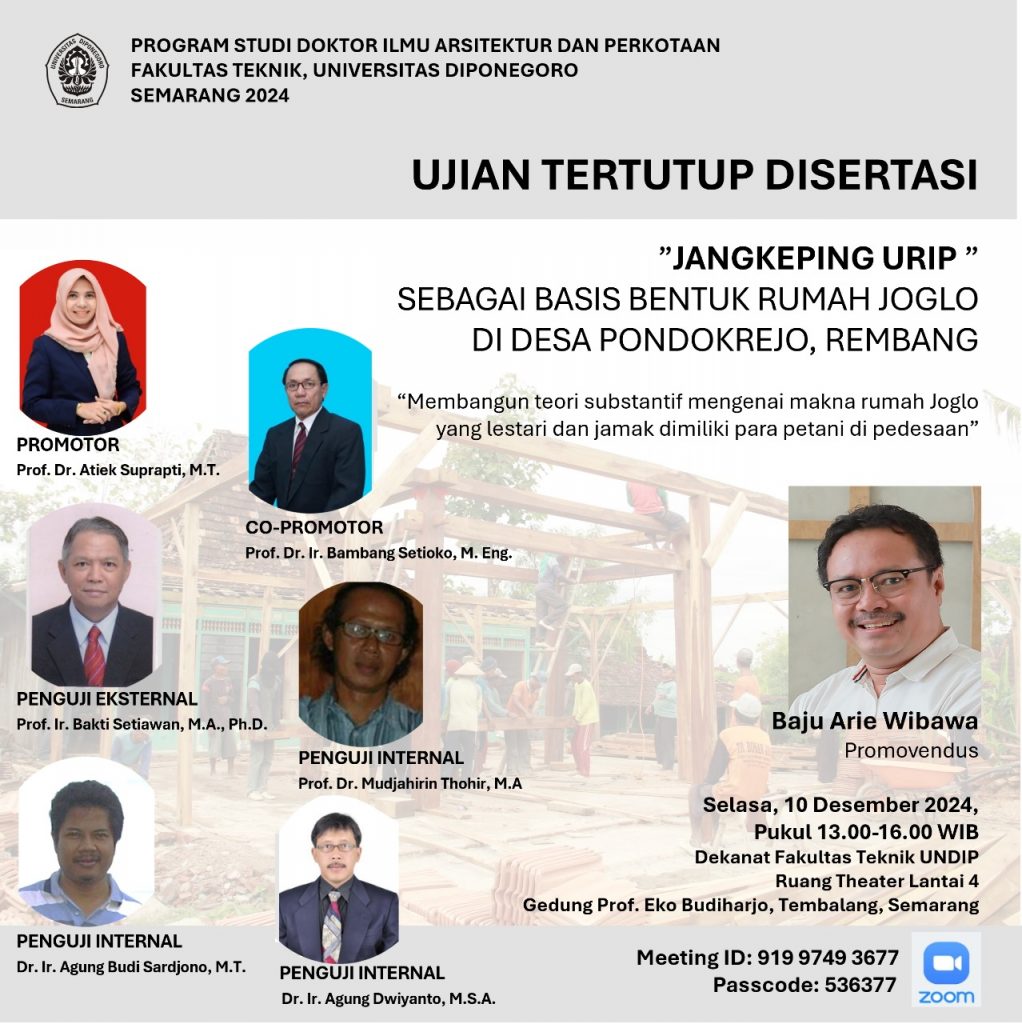 Akan di Laksanakan Ujian Tertutup Disertasi yang berjudul ” Jangkeping Urip Sebagai Basis Bentuk Rumah Joglo di Desa Pondokrejo, Rembang.” oleh Promovendus Baju Arie Wibawa ST, MT. pada tanggal 10 Desember 2024. Dengan susunan penguji : 1) Penguji Eksternal : Prof.Ir. Bakti Setiawan, MA, Ph.D 2) Penguji Internal : Prof. […]