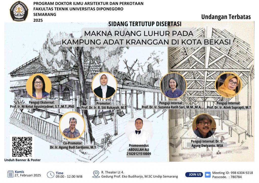 Akan di Laksanakan Ujian Tertutup Disertasi yang berjudul ” Makna Ruang Luhur pada Kampung Adat Kranggan di Kota Bekasi.” oleh Promovendus Abdullah Ali ST MT. pada tanggal 27 Februari 2025. Dengan susunan penguji : 1) Penguji Eksternal : Prof. Ni Ketut Agusintadewi, ST., MT., Ph.D., 2) Penguji Internal […]