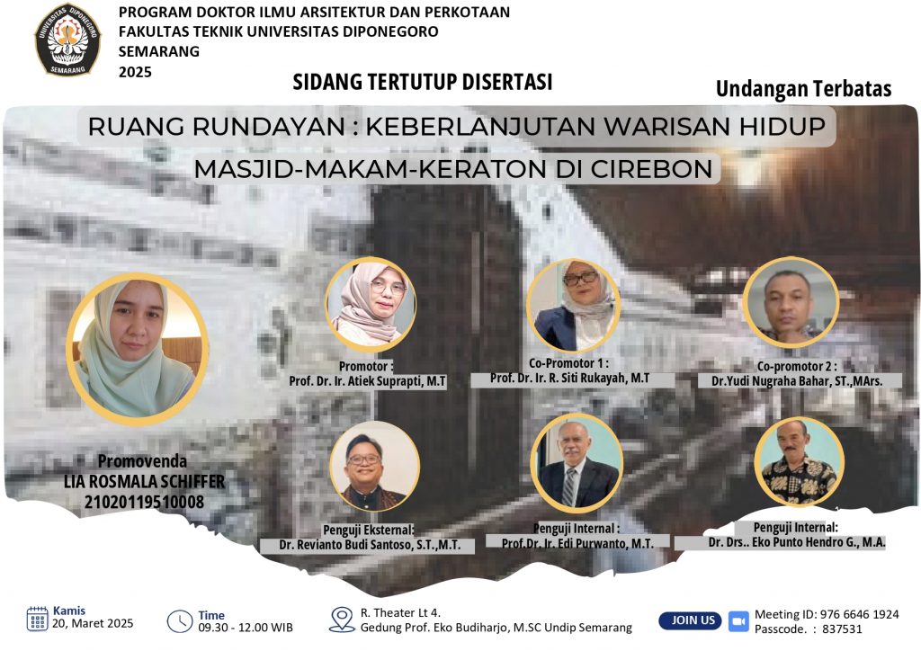 Akan di Laksanakan Ujian Tertutup Disertasi yang berjudul ”kesinambungan Masjid Sang Cipta Rasa Cirebon peninggalan Walisongo, sebagai penggerak keberlanjutan perkotaan melalui partisipasi komunitas lokal” oleh Promovenda Lia Rosmala Schiffer, ST, MT. pada tanggal 20 Maret 2025. Dengan susunan penguji : 1) Penguji Eksternal : Dr. Revianto Budi Santoso, ST, MT. 2) Penguji […]