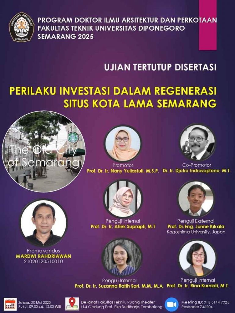 Akan di Laksanakan Ujian Tertutup Disertasi yang berjudul ”Heritage Urban Regeneration in the Review of Investment Behavior in Semarang Old City” oleh Promovendus Mardwi Rahdriawan ST, MT. pada tanggal 20 Mei 2025. Dengan susunan penguji : 1) Penguji Eksternal : Prof. Dr. Junne Kikata. (Kagoshima University, Japan) 2) Penguji Internal […]