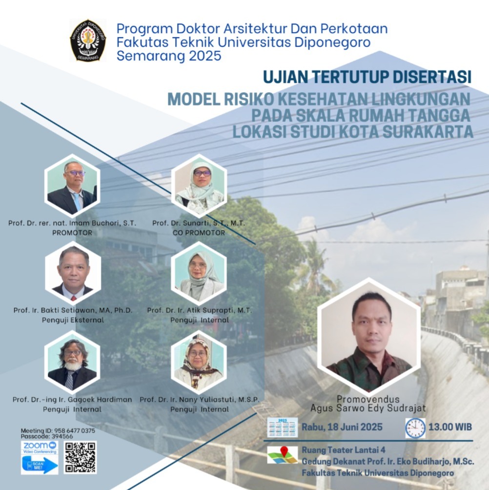 Akan di Laksanakan Ujian Tertutup Disertasi yang berjudul ”Model Resiko Kesehatan Lingkungan pada Skala Rumah Tangga (Lokasi Studi Kota Surakarta)” oleh Promovendus Agus Sarwo Edy Sudrajat, S.T., M.T.. pada tanggal 18 Juni 2025. Dengan susunan penguji : 1) Penguji Eksternal : Proflr. Bakti Setiawan,M.A.,Ph.D, […]
