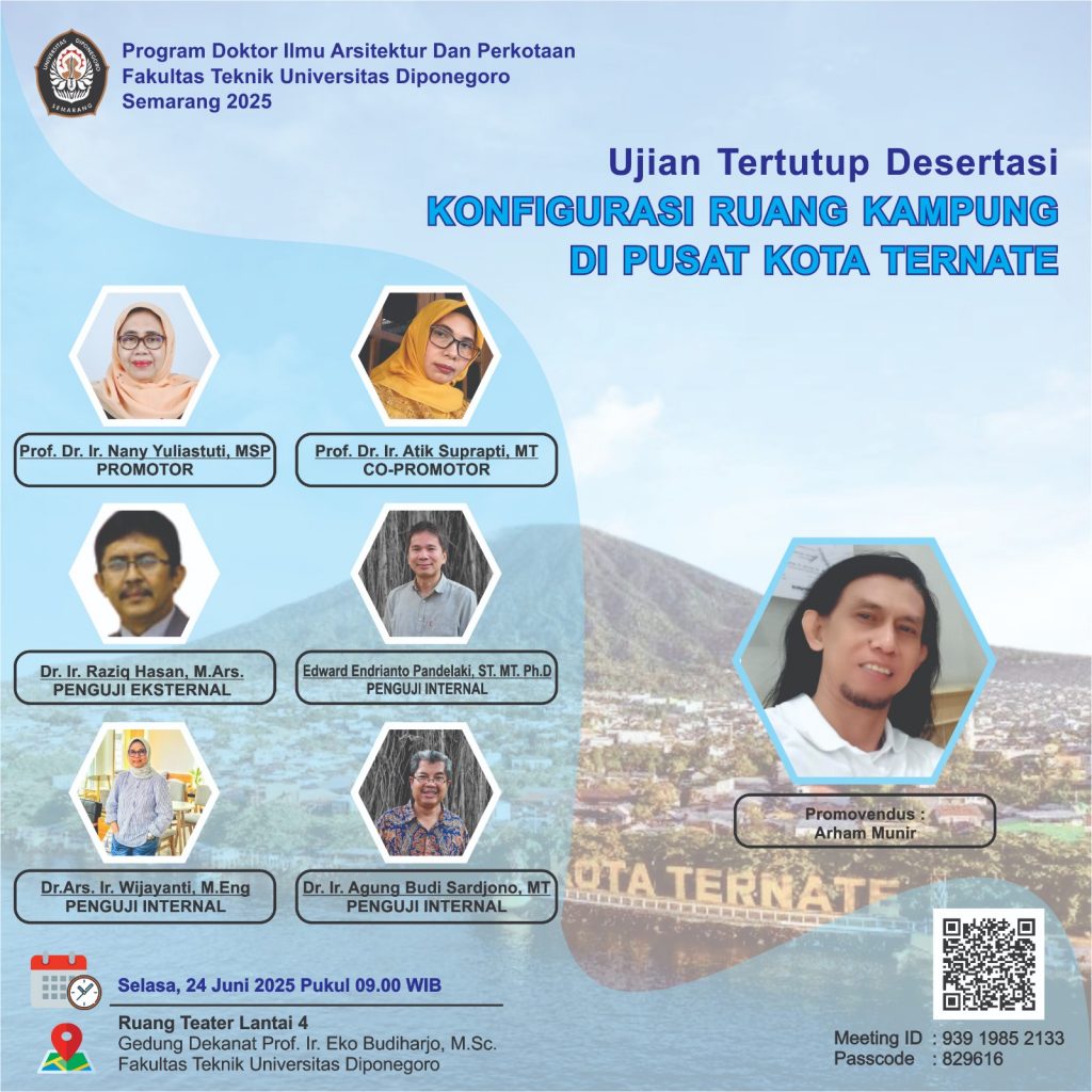 Akan di Laksanakan Ujian Tertutup Disertasi yang berjudul ”Konfigurasi Permukiman Kampung di Pusat Kota Ternate” oleh Promovendus Arham Munir, ST, MT. pada tanggal 24 Juni 2025. Dengan susunan penguji : 1) Penguji Eksternal : Dr. Ir. Raziq Hasan M.Ars (Universitas Gunadarma) 2) Penguji Internal : Dr.Ars. Ir. Wijayanti, […]
