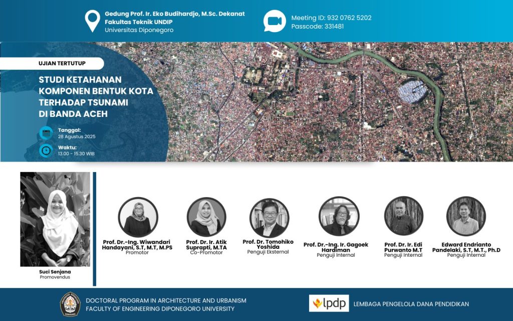 Akan di Laksanakan Ujian Tertutup Disertasi yang berjudul ”Studi Ketahanan Komponen Bentuk Kota Terhadap Tsunami di Banda Aceh, Indonesia” oleh Promovendus Suci Senjana, ST, MA. pada tanggal 28 Agustus 2025. Dengan susunan penguji : 1) Penguji Eksternal : Prof. Dr. Tomohiko Yoshida (Ritsumeikan University ( Japan ) 2) Penguji Internal […]