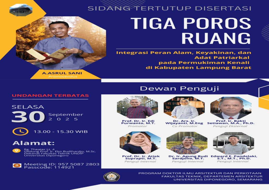 Akan di Laksanakan Ujian Tertutup Disertasi yang berjudul ”Tiga Poros Ruang ” Integritas Peran Alam, Keyakinan, dan Adat Patriarkal pada Permukiman Kenali di Kabupaten Lampung Barat ” oleh Promovendus A. Asrul Sani, S.T., M.T.. pada Tanggal 30 Seprtember 2025. Dengan susunan penguji : 1) Penguji Eksternal : Prof. Ir. Bakti Setiawan, MA, Ph.D (Dosen […]